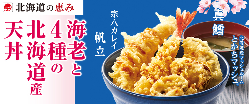 4種の北海道産食材を、定番の「海老」と一緒にお楽しみいただける『海老と4種の北海道産天丼』を3月5日(木)から期間限定販売。