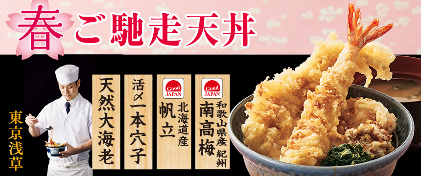 「ごちそうシリーズ」で定番の「天然大海老」「活〆一本穴子」に、「北海道産帆立」、「和歌山県産紀州南高梅」を使用した『春ご馳走天丼』を販売いたします。