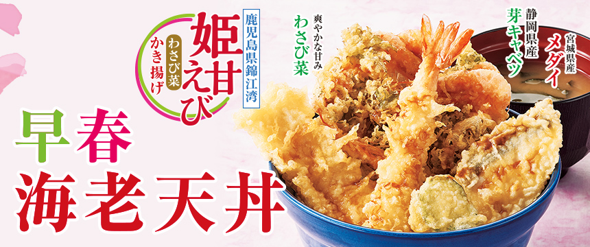 鹿児島県産「姫甘えび」や宮城県産「メダイ」、静岡県産「芽キャベツ」など、香り・食感・彩りが楽しめる一杯、『早春海老天丼』を1月15日(木)から期間限定販売。