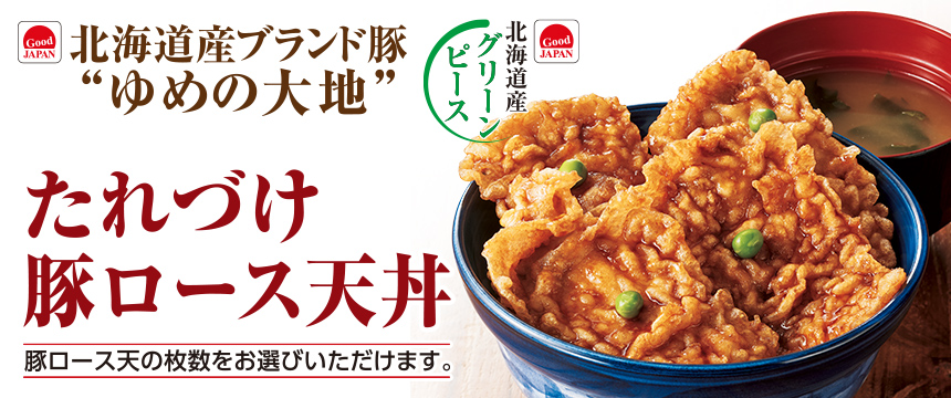 てんやオリジナルの甘辛だれにくぐらせ香ばしく仕上げた人気の“たれづけシリーズ”からは、北海道・十勝地方の名物「豚丼」をイメージした『たれづけ豚ロース天丼』。使用する豚肉は、北海道産ブランド豚“ゆめの大地”です。きめ細やかな肉質が特徴で、噛むほどに広がる旨みと、甘みのある脂をお楽しみいただけます。「ゆめの大地豚ロース天」は、てんや特製の丼たれにくぐらせることで、香ばしい衣とたれのコクが一体となり、ご飯が進む味わいに仕上げました。彩りと食感のアクセントには「北海道産グリーンピース」を添えました。素材の持ち味を活かしながら、天丼ならではの満足感と、十勝地方の「豚丼」を思わせる食べごたえある天丼です。