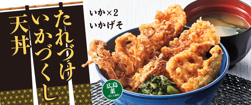 てんやオリジナルの甘辛だれにくぐらせ香ばしく仕上げた人気の“たれづけシリーズ”からは、初となる“いかづくし”な天丼『たれづけいかづくし天丼』が登場。大ぶりで旨みの詰まった人気の「いか」2枚に「いかげそ」を合わせた、まさに“いかづくし”なボリューム満点の一杯です。「ししとう」や「れんこん」、付け合わせの「広島菜」が彩りと食感のアクセントとなり、最後まで飽きることなくお召し上がりいただけます。