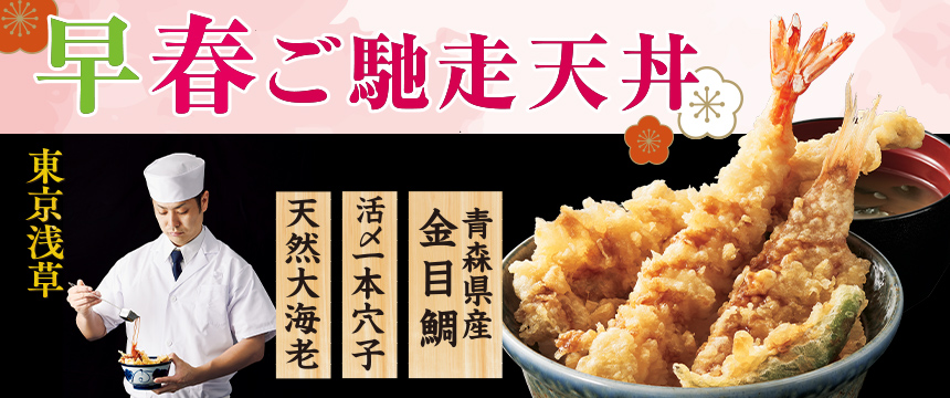 青森県産「金目鯛」、「活〆一本穴子」、「天然大海老」「ししとう」を使用した『早春ご馳走天丼』を1月15日(木)から期間限定販売。