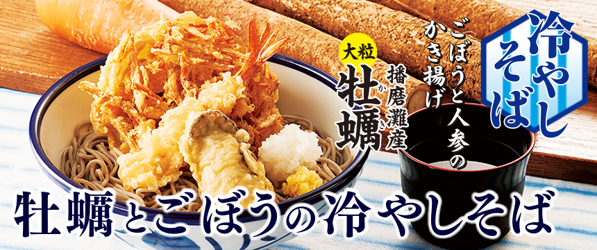 大粒の「播磨灘産牡蠣」と香りの良い「ごぼうと人参のかき揚げ」、定番の「海老」がのった、秋の食材を楽しみながらさっぱりといただける天丼てんやの麺シリーズ第4弾。季節の食材にかつお風味の特製つゆをかけてお召し上がりいただく、まだ暑さが残る時期にぴったりな商品です。