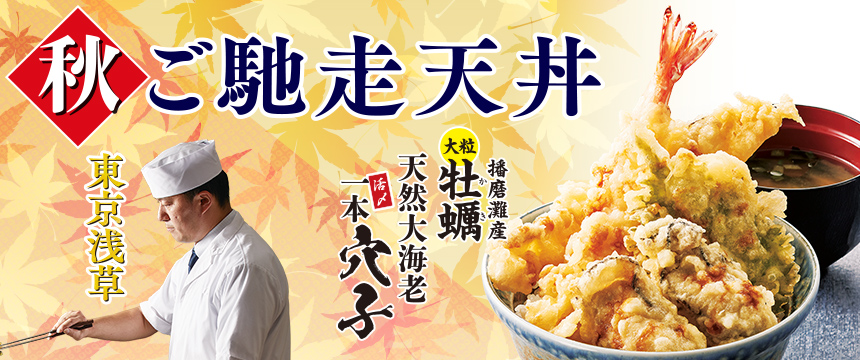 「ごちそうシリーズ」で定番の「天然大海老」「活〆一本穴子」に、大粒の「播磨灘産牡蠣」、「大葉」を使用した『秋ご馳走天丼』を販売いたします。