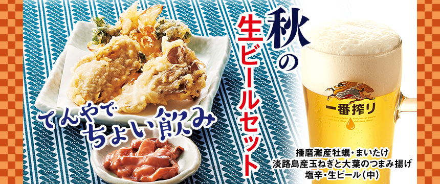 季節の天ぷら「播磨灘産牡蠣」、「まいたけ」、「淡路島産玉ねぎと大葉のつまみ揚げ」に「塩辛」、「生ビール(中)または日本酒」がセットになったちょい飲みメニュー。天丼てんやで季節を感じながらサクッとお酒を楽しみたい方におすすめのメニューです。