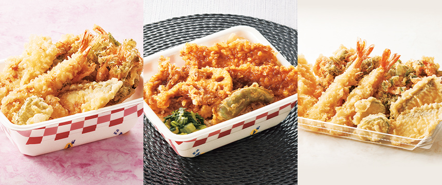 てんやオリジナルの甘辛だれにくぐらせ香ばしく仕上げた人気の“たれづけシリーズ”からは、初となる“いかづくし”なお弁当『たれづけいかづくし天丼弁当』が登場。大ぶりで旨みの詰まった人気の「いか」2枚に「いかげそ」を合わせた、まさに“いかづくし”なボリューム満点のお弁当です。「ししとう」や「れんこん」、付け合わせの「広島菜」が彩りと食感のアクセントとなり、最後まで飽きることなくお召し上がりいただけます。