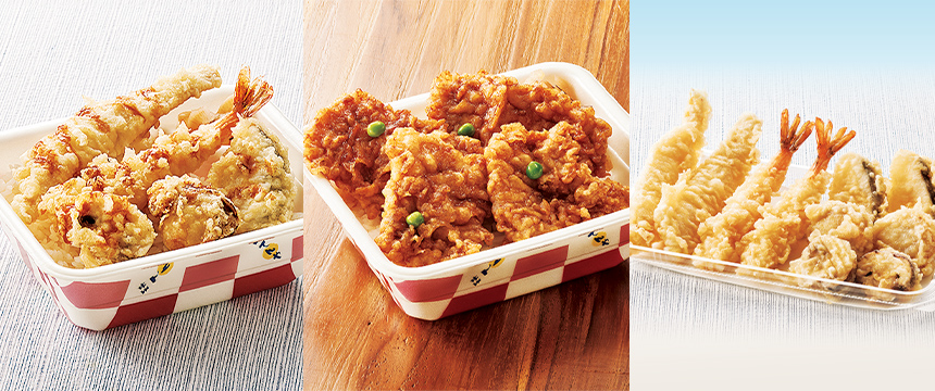 お持ち帰りできるオールスター天丼弁当、いろどり天丼弁当、とり天丼弁当、海老と野菜の上天丼弁当、海鮮かき揚げ天丼弁当、鶏と舞茸の天丼弁当、野菜天丼弁当、てんやの天丼弁当、(小)藪そば・小うどん、豚汁、盛合わせもご用意しております。