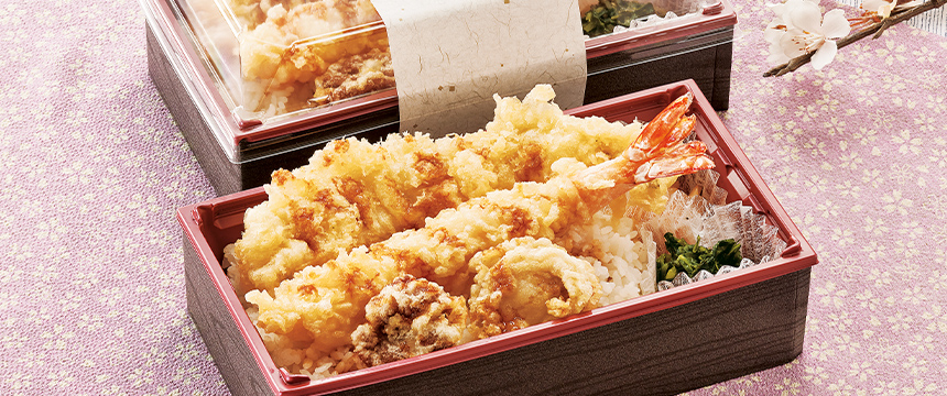 ふっくらとした食感の「北海道産宗八(そうはち)カレイ」をはじめ、旨みが凝縮された「北海道産帆立」、雪深い寒い季節から旬を迎える「北海道産真鱈」など、北海道産の魚介を贅沢に使用。さらに、濃厚な旨みの「北海道産とかちマッシュ®(マッシュルーム)」をあわせ、4種の北海道産食材を、定番の「海老」と一緒にお楽しみいただけるお弁当に仕上げています。天ぷら一つひとつの素材の良さを活かしながら、北海道の味覚を堪能できる、満足感あふれる贅沢なお弁当です。